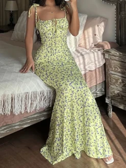 2025 Summer Floral Midi Dress Women Spaghetti