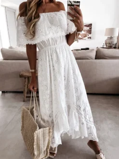 Women Bohemian White Long Dress Short Sleeve Off Shoulder Lace Ruffle Loose Dress