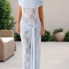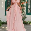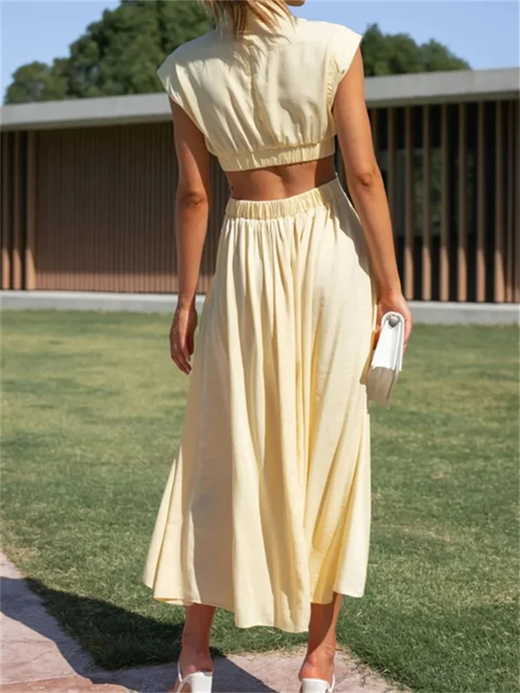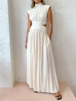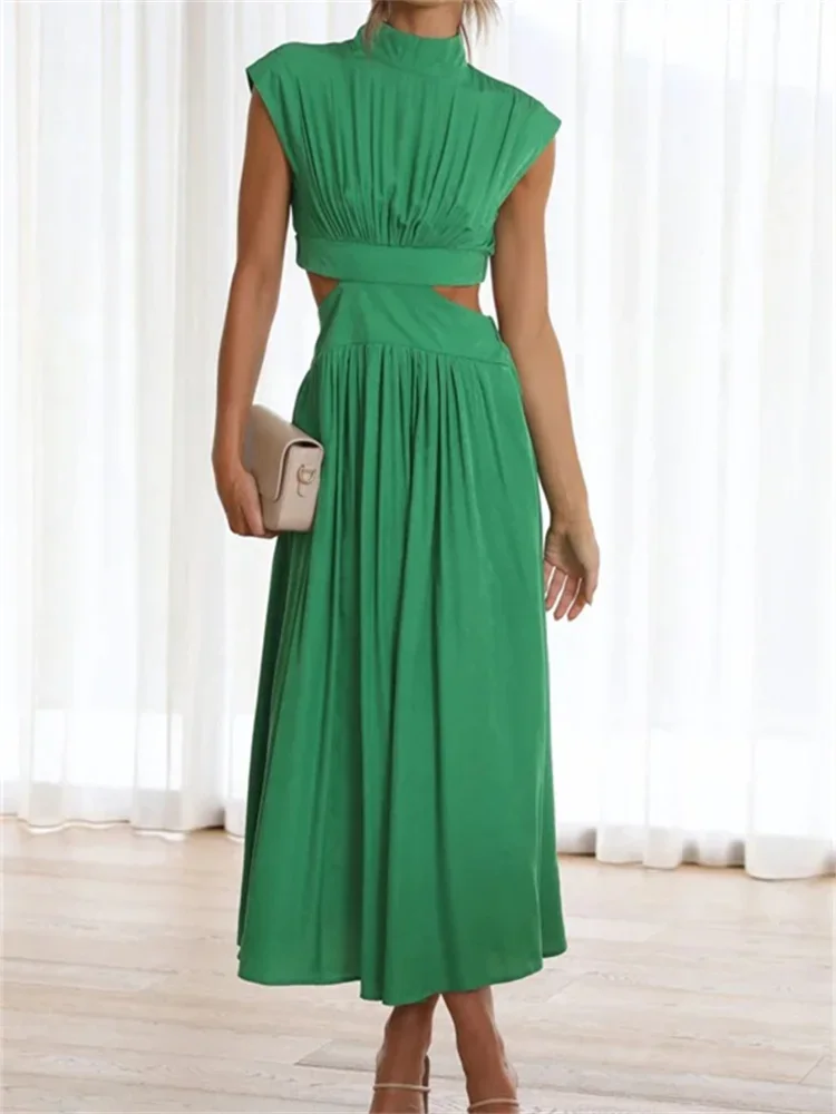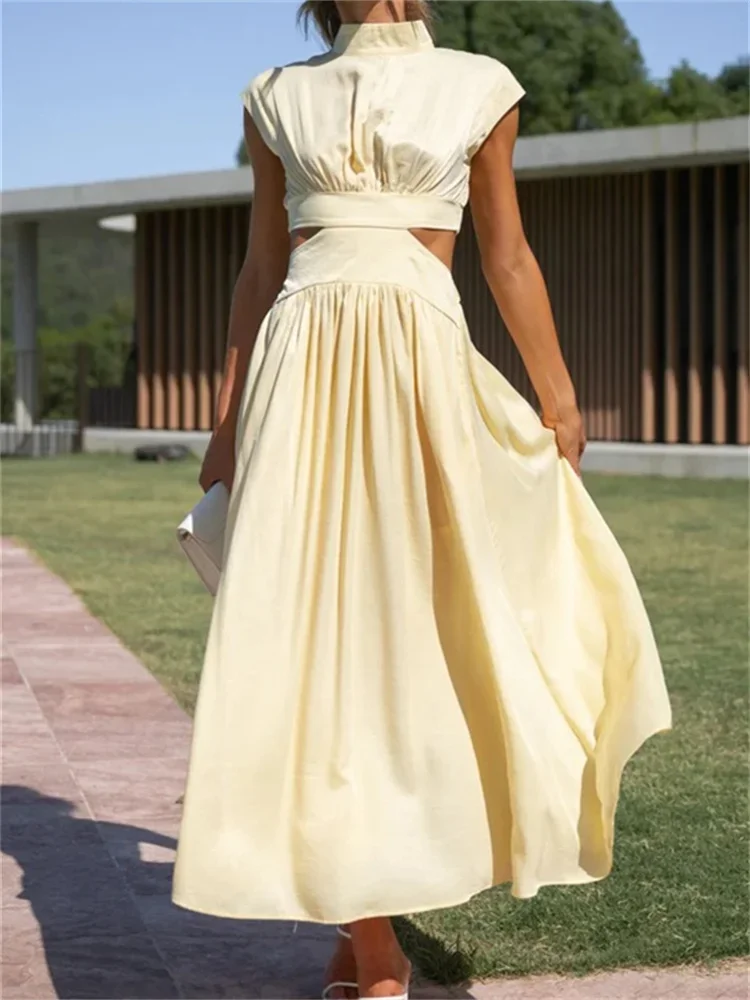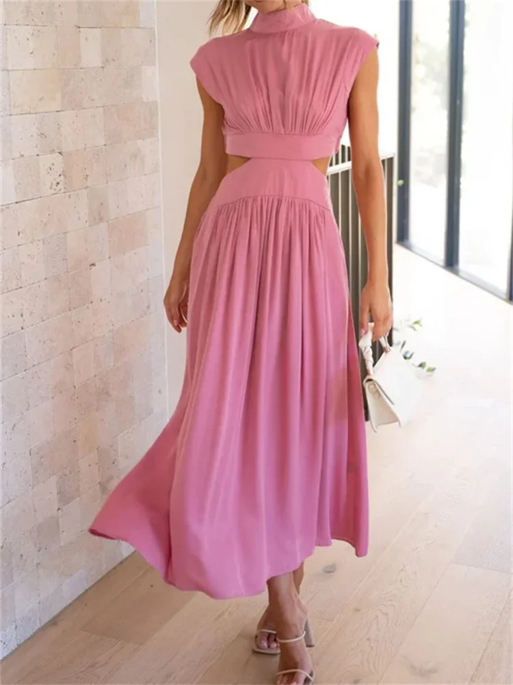 Women Summer Casual Long Dress Solid Color Stand Collar Waist Hollow-Out Sleeveless Dress Beach Holiday Loose Dress