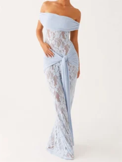 Women's Long Evening Dress Off Shoulder Knotted Slim Lace Dress